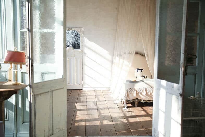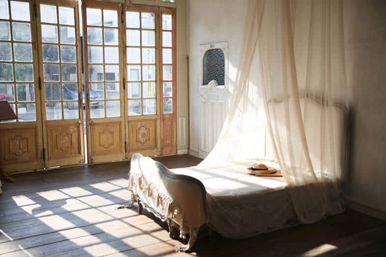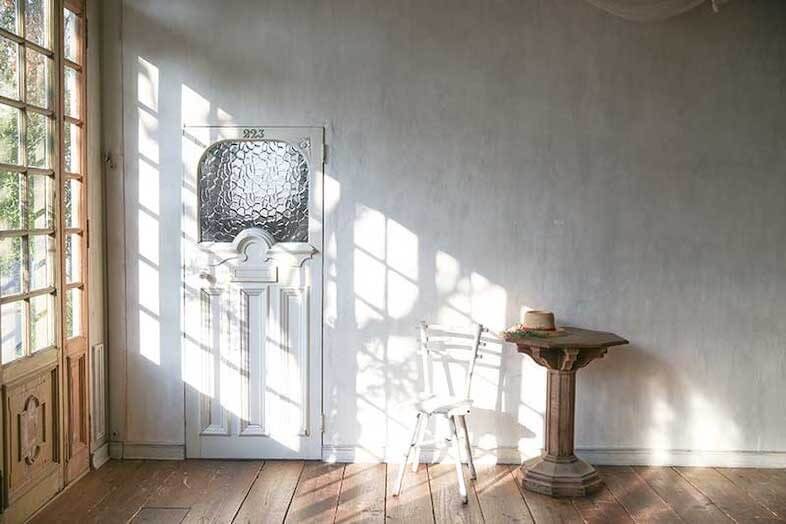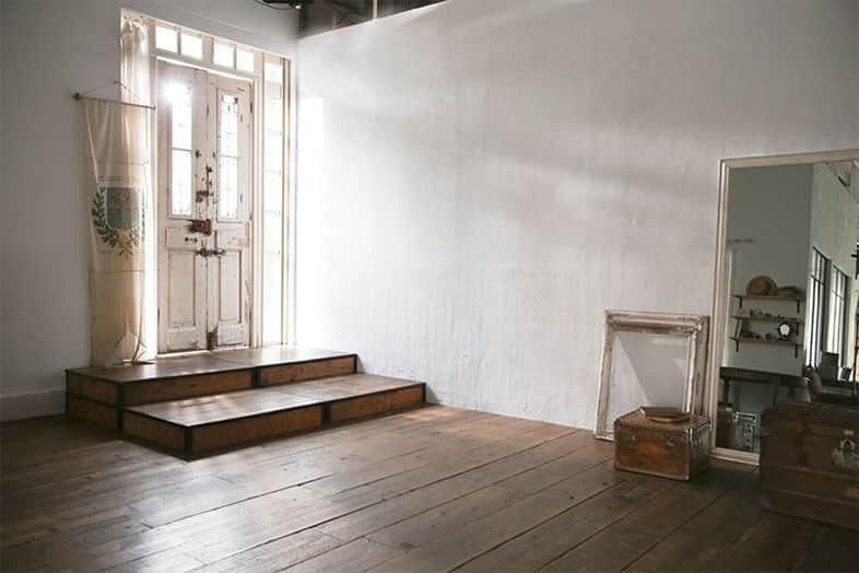 透け感のあるカーテンから差し込む柔らかな光を利用して、優雅で穏やかな雰囲気の撮影が可能です。スタジオ内にはグリーンやアンティークな小物が充実しており、ナチュラルな雰囲気の撮影が楽しめます。