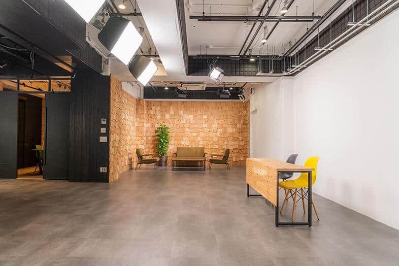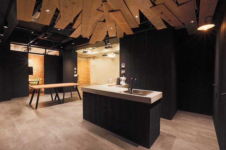 ABANK STUDIO最大の特徴は、エントランスを進んだ先に広がる、仕切りのない大きな空間。 真っ黒な焼杉の壁、四角い小さな木材を鱗のように貼り合わせた壁、そしてベーシックな白い壁。 表情の異なるエリアのどこを選ぶかで、さまざまな雰囲気の映像を撮ることができます。