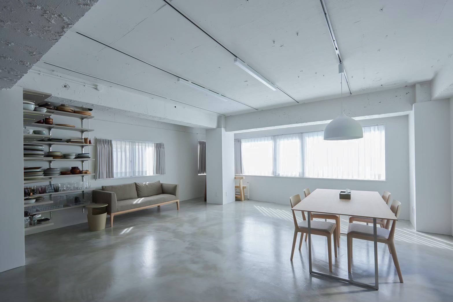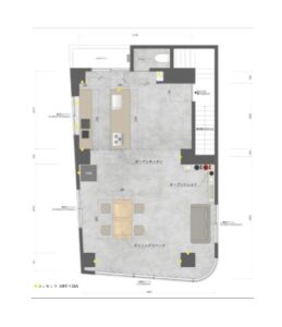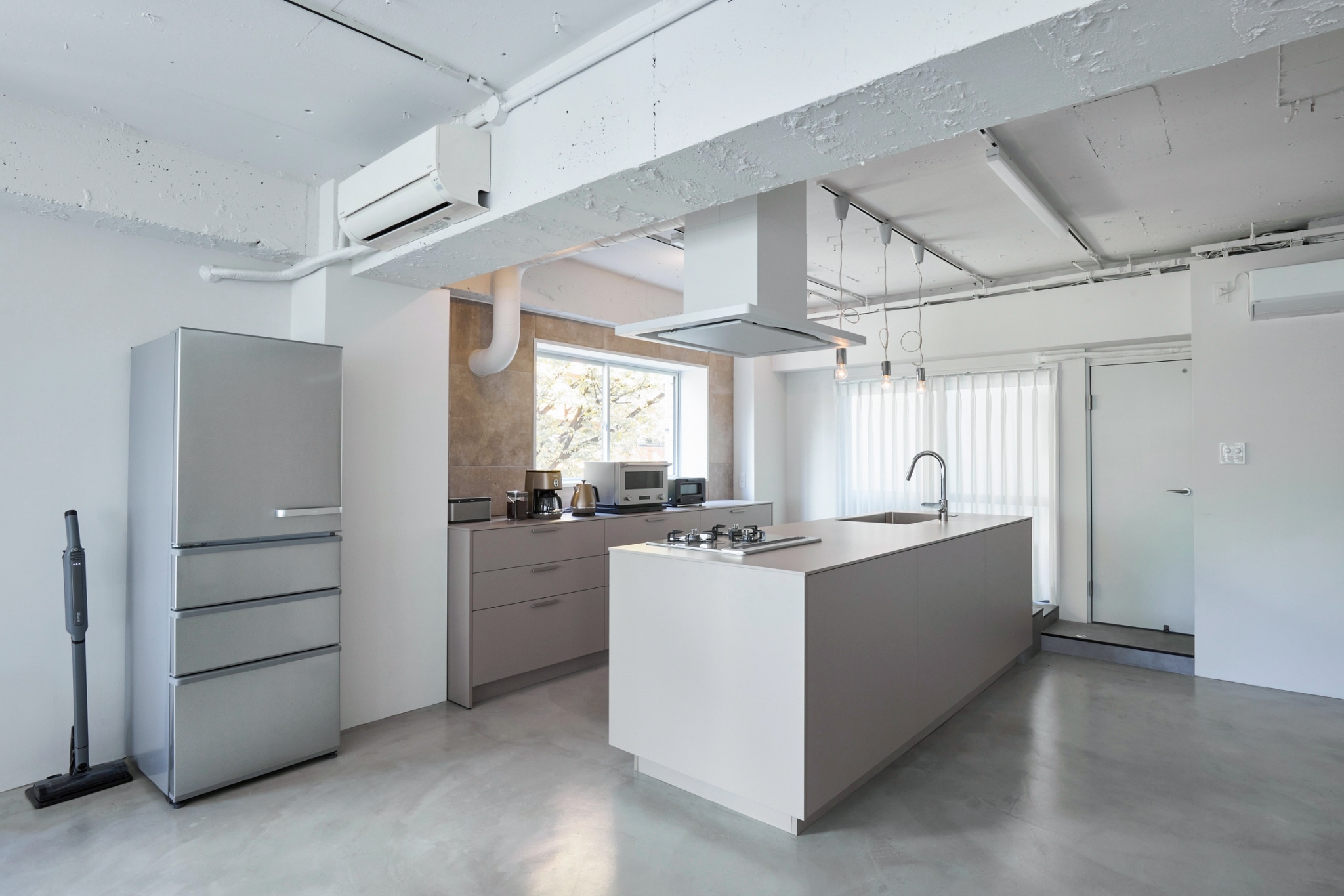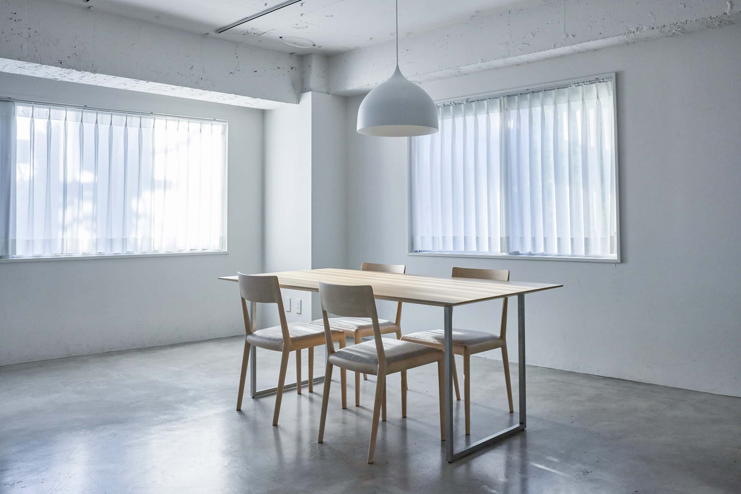 モルタル床に白壁、トープカラーの大理石風アクセントウォールと建築家隈研吾デザインを含むTIME&STYLEのシンプルでモダンな家具で統一された空間は清潔感があり、Web広告やYouTube、インスタグラムなどのSNS撮影、雑誌撮影におすすめです。