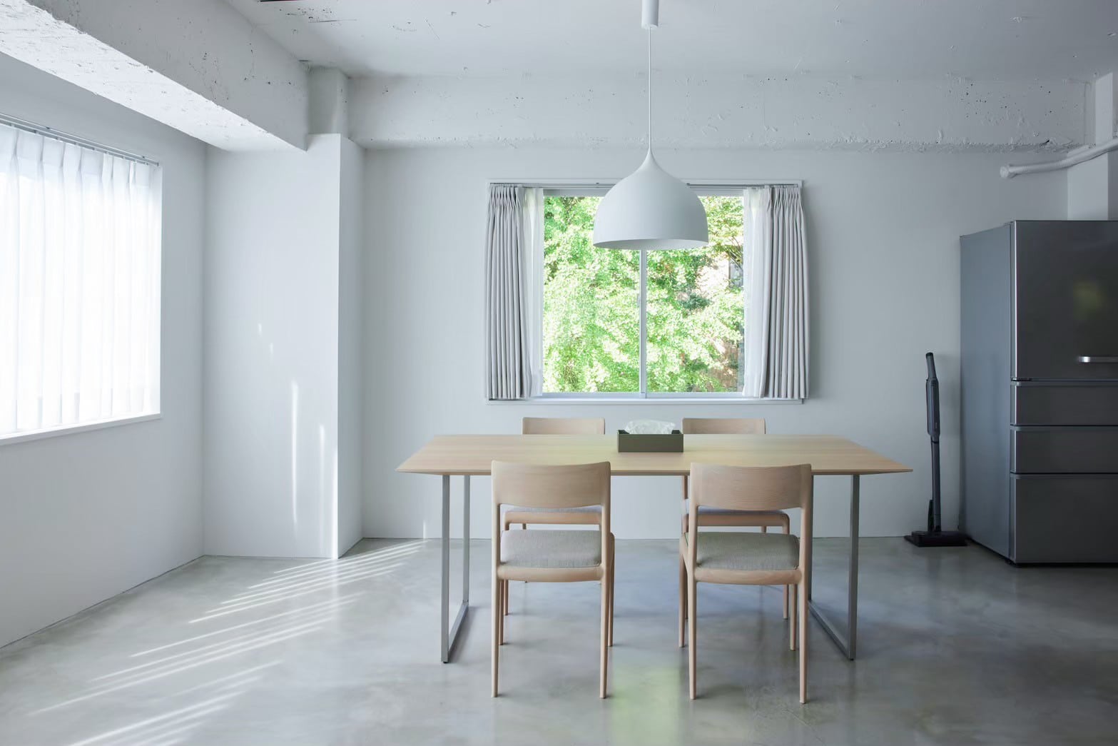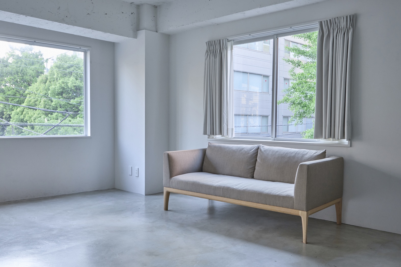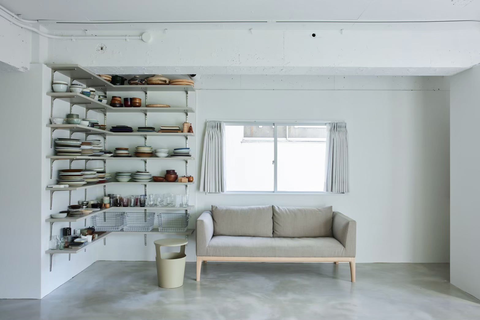 モルタル床に白壁、トープカラーの大理石風アクセントウォールと建築家隈研吾デザインを含むTIME&STYLEのシンプルでモダンな家具で統一された空間は清潔感があり、Web広告やYouTube、インスタグラムなどのSNS撮影、雑誌撮影におすすめです。